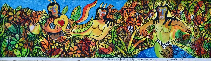 Avant leur arrivée à Saint Martin, les artistes avaient déjà des idées plein la tête, mais il n'est pas toujours aisé de deviner ou d'apprécier les peintures à leur juste valeur. Julia Collaro a par exemple participé à la fresque participative intitulée « Flow of Life »(au portail d'entrée de l'hôtel). Un arbre de vie qui suggère que toutes les formes proviennent d'une même source et offrent la saveur de l'unique. « Irma dans tous ses états » est l'oeuvre de Jean- Jacques François, qui a choisi de représenter désolation et dommages subis par l'île lors de l'ouragan Irma. Une magnifique sirène symbolise l'océan sur la droite tandis que la partie gauche représente le futur et la résurrection de l'île grâce aux efforts de la population. De son côté, Christophe Cosentino a choisi de peindre « Petite faune au fruit de la passion amoureuse « (ci-dessous), avec les faunes féminines qui vivent en totale liberté et en pleine nature, jusqu'à ce que la passion amoureuse ne vienne un jour se saisir de l'une d'elles.