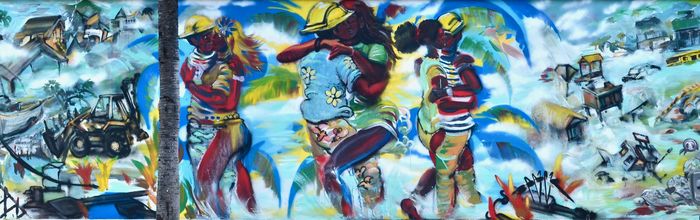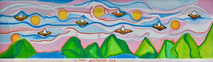 Autre fresque, autre talent : « Un jour Charlou Biascamano a tiré la traine tout seul », œuvre d'Aldo Biascamano qui a ainsi transporté la mythologie sétoise jusqu'à l'île Saint Martin, avec, en toile de fond, le Mont Saint-Clair et une scène pêche au premier plan. Philippe Loubat a pour sa part choisi de faire référence à Saint-Exupéry et à son Petit Prince. Sa fresque « Long courrier vers le pic du Paradis » se décompose en trois parties : dans le ciel, les oiseaux évoquent paix et légèreté tandis qu'au sol, les maisons multicolores dansent avec au fond les montagnes de Saint-Martin. L'important n'est-il pas de redonner du bonheur et le sens de la fête aux Saint-Martinois ? L'artiste Lucas Mancione, lui, est parisien d'origine sétoise et a choisi de réaliser sa fresque « No Ananas »(ci-dessous). Celle-ci intègre dès le départ cinq soleils, avant que l'inspiration des lieux n'oriente le peintre vers le ciel et les montagnes, éléments marquants du paysage local. Histoire de surprendre le spectateur, Lucas rajouta ensuite quelques ovnis. Marc Duran a peint de son côté « Le Printemps » avec des fleurs multicolores et des petits textes qui s'entremêlent dans une même danse. Pour Frédéric Périmon, c'est le mur du son qui est franchi, avec « Wall of sound » représentant haut-parleurs, baffles et enceintes. En hommage à la musique caribéenne qu'il aime tant. Terminons ce tour d'horizon non-exhaustif avec « Pause Tendresse » (deuxième photo ci-dessous), œuvre de Sliman Ismaili Alaoui (dit Nascio) qui exprime un moment de détente après ce terrible ouragan. Le naturel reprend le dessus avec convivialité, joie et bonheur ainsi que ces trois couples de danseurs.