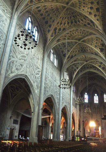 Ma première halte sera pour la cathédrale, édifiée au 15è siècle par les Franciscains. D'abord église, l'endroit ne deviendra cathédrale qu'en 1779, lors de la création de l'évêché de Chambéry. J'avoue être un peu déçu en apercevant cette façade qui manque de majesté lorsqu'on s'attend à une « vraie » cathédrale. Cette apparence s'explique par la modestie naturelle des Franciscains et aussi par l'instabilité offerte par le sous-sol marécageux (qui nécessitera l'installation de 30000 pilotis de mélèze pour soutenir les fondations d'une construction peu élancée). Mais cette première impression sera « trompeuse » et pour cause : l'essentiel, invisible de l'extérieur, se voit à l'intérieur, car l'édifice religieux surprend par sa grandeur et par son style gothique flamboyant très simple. Mieux, ce qui caractérise la cathédrale Saint François de Sales reste avant tout les peintures en trompe l'oeil qui recouvrent ses murs et ses voûtes. Celles-ci furent réalisées en 1834 par un certain Casimir Vicario qui mit en exergue le style gothique troubadour alors très populaire en Savoie. Et la cathédrale d'abriter ainsi le plus grand ensemble de décors peints d'Europe, avec ses 6000 m2 de fresques qui parent les dentelles de pierre et les voûtes de l'édifice.