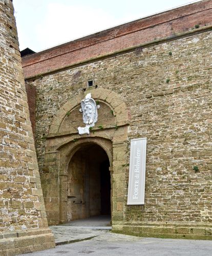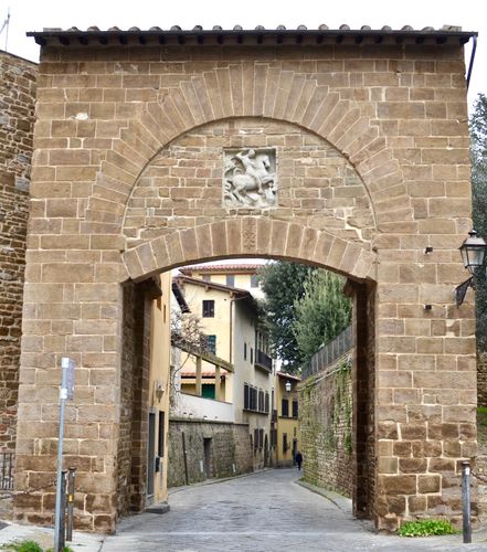 La voie San Giorgio aboutit à une porte du même nom qui fut construite en 1260 et reste aujourd'hui la plus ancienne porte de Florence (ci-dessous). C'est Bicci di Lorenzi qui en peindra la fresque ornant l'intérieur de l'arc, au début du 15è siècle, même si, au fil du temps, il devint impossible d'en distinguer les détails. Et de représenter la Vierge avec Saint Georges et Saint Léonard. La sculpture de Saint Georges terrassant le dragon n'est par contre qu'une réplique de l'originale qui date de 1284. En franchissant la porte, on accède sur la droite au Forte di Belvedere, dessiné par Bernardo Buontalenti en 1590, sur une commande de Cosme 1er, le Grand-Duc Ferdinand 1er de Médicis. L'édifice central servira de résidence au Grand-Duc lors des périodes troubles comme l'épidémie de peste de 1600, faute de jouer un rôle véritablement défensif face aux attaques rivales. Site stratégique, l'endroit offrait néanmoins une vue suffisamment précise des rues de la cité pour permettre aux soldats de tirer au canon sur la foule en cas d'émeute. De là, on jouit aussi d'un joli panorama sur les jardins de Boboli et sur la campagne florentine versant sud.