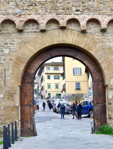 En redescendant la Via di Belvedere (laquelle longe une portion des anciens remparts de la cité qui datent de 1258), on débouche sur une petite arche creusée dans le mur de la fortification, la porte San Miniato (ci-dessous). Construite en 1320, dans le cadre de l'édification du sixième cercle de murs, celle-ci dispose d'une structure qui diffère des autres portes : les sentinelles gardaient en effet la zone en utilisant uniquement une passerelle située au-dessus de la porte. Une fois la porte franchie, je tourne à droite pour me retrouver dans la Via del Monte alle Croci que je remonterai jusqu'au viale Galileo Galilei. Et de tourner encore à droite pour atteindre un large escalier qui me conduira jusqu'à la terrasse de San Miniato al Monte.