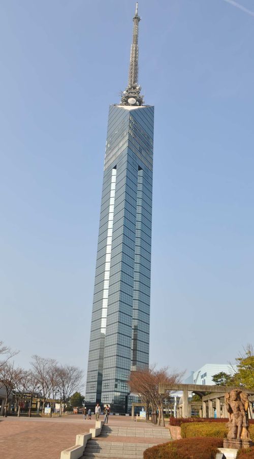 La Fukuoka Tower elle mesure 234 mètres de haut ( avec ses antennes ) et est la plus haute du Japon en bord de mer , symbole aussi de la ville de Fukuoka. Elle offre une vue splendide, de préférence par beau temps sur les environs, mais le déplacement vaut aussi d'être fait la nuit tombée. La tour s'illumine alors et apparaît comme magique. Elle a été construite afin de résister à des tremblements de terre de magnitude 7 . C'est plutôt rassurant. Pour info, le tremblement de terre le plus sérieux subi par Fukuoka était de magnitude 6.