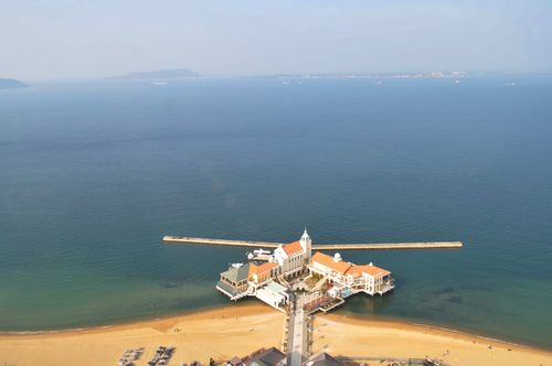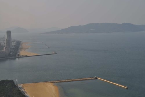 Face à la tour, la mer , plein nord, avec au large, légèrement à gauche , l'île de Nokonoshima, à dix minutes de là en ferry, avec ses champs , ses narcisses et ses anciens sanctuaires, en face au loin, Shikanoshima et le Marine World ( un ferry vous y conduit en un quart d'heure), et juste au pied de la tour, Marizon, avec ses boutiques de marins , son hall de mariages et ses restaurants.