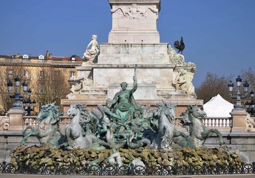 Un peu plus bas, on peut distinguer trois femmes, Bordeaux, La Garonne et la Dordogne. Le tout est entouré d'un ensemble de fontaines, au sud et au nord, composées d'imposants chevaux. C'est la Fontaines des Girondins.