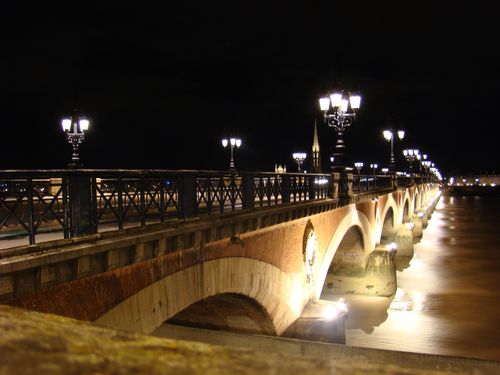 Enjambant la Garonne, voici le pont de pierre. Il resta pendant longtemps le seul moyen de traverser le fleuve. Appelé aussi Pont Napoléon, il fut inauguré en 1822 puis élargi en 1954. Directement dans l'axe du cours Victor Hugo, il relie le centre ville à la Rive droite de la Garonne. Doté de passages piétons et de pistes cyclables, on le franchit en tramway et en voiture. En 2004, des travaux ont été effectués afin de permettre le franchissement des barges transportant les morceaux de l'A380. Ce pont est équipé de galeries , passages et cavités. Certaines d'entre elles sont parfois ouvertes au public, les autres sont utilisées par les techniciens chargés de l'entretien du pont de pierre. Ce pont demeure aujourd'hui comme l'un des monuments symbole de la ville de Bordeaux. De cet endroit sont tirées les feux d'artifice, et l'on s'en sert encore de décor pour la fête du fleuve et la fête du vin. Œuvre de Claude Deschamps, le pont de pierre comporte 17 arches et s'étend sur plus de 500 mètres. On remarquera que le nombre d'arches correspond au nombre de lettres servant à écrire Napoléon Bonaparte. Si les piles et les arcs sont bel et bien en pierre, les voûtes,elles, comportent des briques qui donnent au pont une teinte rougeoyante. La première pierre fut posée en décembre 1812et le pont sera inaugré dix années plus tard en mai 1822.