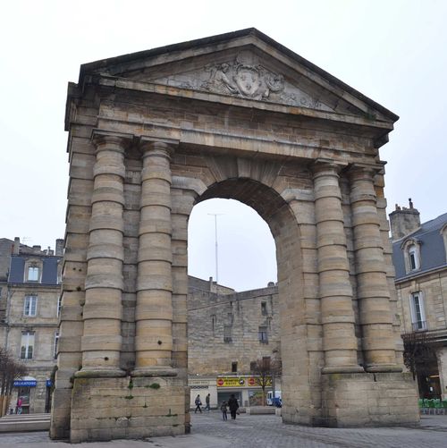 Située Place de la Victoire, la Porte d'Aquitaine permet d'accéder à la rue Sainte Catherine, la plus longue rue piétonne d'Europe, dit-on ici avec fierté. Mais nous y reviendrons. En forme d'arc de triomphe, elle s'appela autrefois la Porte Saint Julien tout comme d'ailleurs la place où elle se trouve, laquelle ne devint Place de la Victoire qu'en 1918. Construite en 1753, cette porte monumentale est surplombée par un fronton triangulaire richement sculpté. Côté rue Sainte Catherine, les sculptures sont généreuses: Armoiries de Bordeaux, Grosse Cloche et léopard, tonneaux et même un perroquet! Côté place, ce sont des sculptures de dieux marins avec des fleurs de lys.
