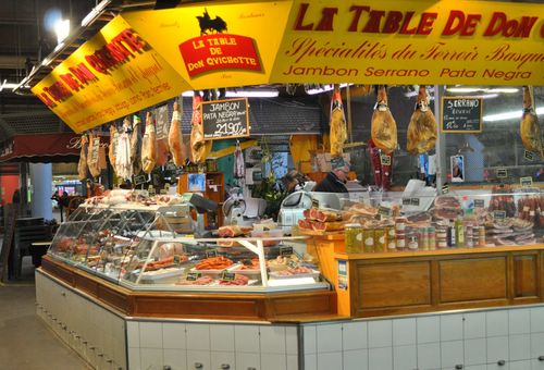 Je marche en direction du Marché des Capucins. Y a t-il un endroit qui reflète mieux l'âme d'un quartier que son marché? Sous sa halle, le marché des Capucins, appelé aussi « ventre de Bordeaux » reste très ancré dans l'histoire de la cité et l'un des plus anciens marchés bordelais, mais sans doute le plus populaire. Cette « Halle des Capucins » aujourd'hui disparue était en bois. Elle fut remplacée vers 1880 par deux halles à ossature métallique dans l'esprit architectural Baltard et fut construite à l'aide d'éléments récupérés su l'Exposition Universelle de Paris. C'est en 1959 que ces deux halles seront détruites, laissant la place aux bâtiments actuels. La création du Marché d'intérêt national de Bordeaux en 1953 porta un coup fatal au marché des Capucins. Les grossistes quitteront ce petit marché . Heureusement , ce marché vit toujours grâce aux marchandes des quatre saisons et à leurs charrettes ( autrefois 400, elles ne sont plus qu'une vingtaine) installées à l'extérieur du bâtiment, côté Saint Michel, et aux soixante commerces qui occupent la place, parmi lesquels fromagers,bouchers, poissonniers...