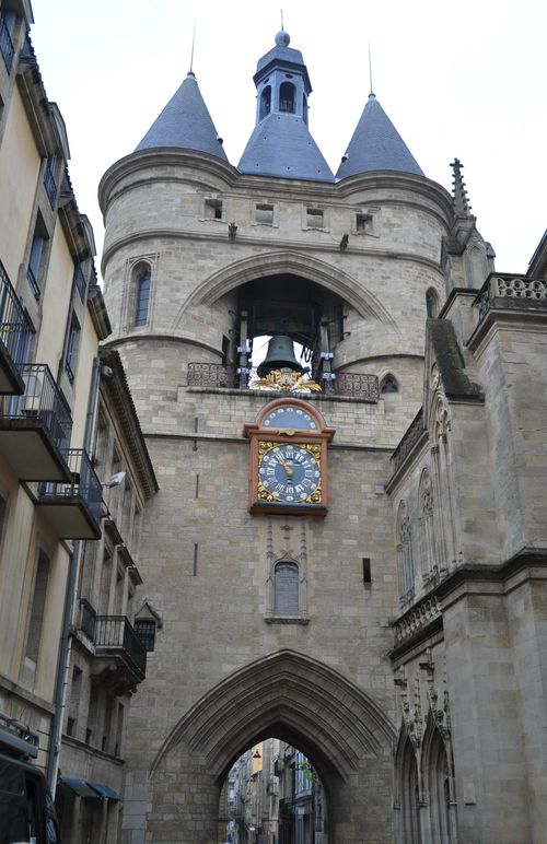 Rejoindre le cours Victor Hugo me fait traverser de vieilles rues pleines de charme. J'en trouverai une autre, minuscule, l 'impasse de la Fontaine-Bouquière, vestige de l'enceinte médiévale (1220) qui donne sur le cours Victor Hugo. Ce cours a depuis 2007 été rénové. Il correspond aux anciens fossés de l'Hôtel de Ville. J'aperçois bientôt la Grosse Cloche , ancien beffroi de l'Hôtel de Ville qui servait aussi de porte dans les remparts. C'est l'un des rares monuments moyenâgeux encore conservé à Bordeaux. Edifiée au XV ème siècle sur les restes de la porte Saint Eloi, et adossée à l'église du même nom ( lieu de rendez-vous pour les pèlerins de Saint Jacques de Compostelle) elle est composée de deux tours circulaires de 40 mètres de haut reliées par une partie centrale dominée par le léopard d'or. C'est de là que les magistrats de la ville sonnaient la cloche pour donner le signal des vendanges ou alerter la population en cas d'incendie. Les bordelais ont toujours été attachés à sa cloche. Celle-ci fut brisée par le roi Henri II pour les punir de leur révolte en 1548 ( la jacquerie des pitauds). Elle revint en 1561. La cloche actuelle fut coulée en 1775 par le fondeur Turmel et pèse 7800 kg. L'horloge, construite en 1759 d'après les plans de l'astronome Paul Larroque, remplaça celle de 1567 exécutée par Raymond Sudre. La girouette arbore un léopard anglais qui rappelle les armes de la Province de Guyenne dont Bordeaux était la capitale. Le quartier Saint Eloi où se situe la Grosse Cloche connut un développement important lors de l'essor du négoce et des échanges méditerranéens avec notamment la création du marché en 1155, de l'Hotel de Ville en 1297 ( tout près de la Grosse Cloche), puis fondation des paroisses Sainte Colombe et Saint Eloi en 1159, construction de l'hôpital Saint Jacques en 1175... De nouveaux bourgeois apparurent à cette époque, directement issus de cette société nouvelle constituée de marchands et de tenanciers, parmi lesquels Monadey, Cailhau, Soler ou Colomb.