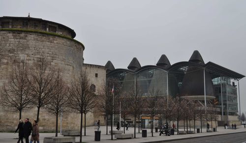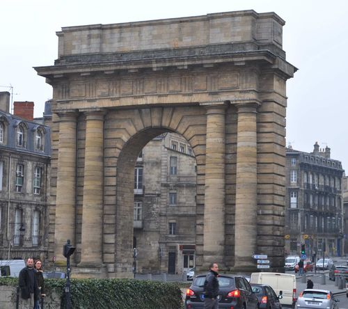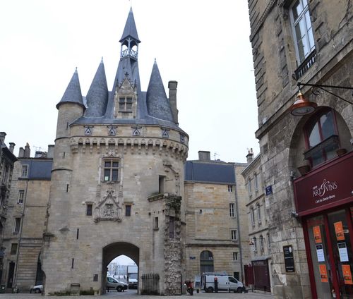 Depuis le pont de pierre, je longe les quais. Tout en admirant les jolies façades d'immeubles qui ont été restaurées depuis quelques années. Bordeaux était en fait une belle endormie qui s'est réveillée sous l'impulsion d'une nouvelle politique de la ville facilitant notamment la rénovation des bâtiments. Quelques minutes plus tard, j'accède à la Porte Cailhau: Celle-ci fait partie des anciens remparts de la cité, et est aussi surnommée Porte du Palais. Classée monument historique depuis 1883, son nom pourrait certes évoquer les cailloux ( calhaus en gascon) qui étaient accumulés à ses pieds par la Garonne et qui servaient au lestage des navires. Mais plus vraisemblablement, elle pourrait tirer son nom d'une grande famille bourgeoise bordelaise médiévale, la famille Cailhau, qui donna plusieurs maires à cette cité aux XIII ème et XIV ème siècles. De style gothique Renaissance, avec des toits aigus d'une hauteur de 35 mètres, avec ses lucarnes et ses lanternes, elle symbolise le souvenir de la victoire remportée par Charles VIII en 1495 à la Fornoue ( ville située à 20 km de Parme en Italie).Elle faisait à la fois office d'arc de triomphe et de porte défensive. Ses bas-reliefs, qui ont souffert avec le temps , peuvent être admirés au Musée d'Aquitaine.