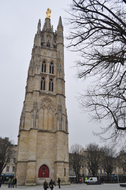 La Tour Pey Berland ( du nom de l'archevêque du même nom) est située à côté de la Cathédrale Saint André. Elle fut construite de 1440 à 1500 à l'initiative de l'archevêque. Couronnée par un clocher, elle a toujours été isolée de la Cathédrale. A la Révolution française, elle fut vendue et transformée en fabrique de plombs de chasse. La flèche qui disparut lors de vents d'ouragan au XVIII ème siècle laisse la place aujourd'hui à une statue de la Vierge à l'enfant dorée, appelée Notre Dame d'Aquitaine et tournée vers le Médoc, région d'origine de Pey Berland. Le clocher abrite un bourdon de 8 tonnes. On pourra s'étonner de voir cette tour isolée de la cathédrale mais il y a de nombreux exemples similaires dans la région et même à Bordeaux ( avec la Tour Saint Michel). Cependant, la Tour Pey Berland ne fut pas toujours isolée. Elle était autrefois reliée à la Cathédrale Saint André par les maisons des Chanoines ( coutume alors en vigueur dans l'Ouest de la France).