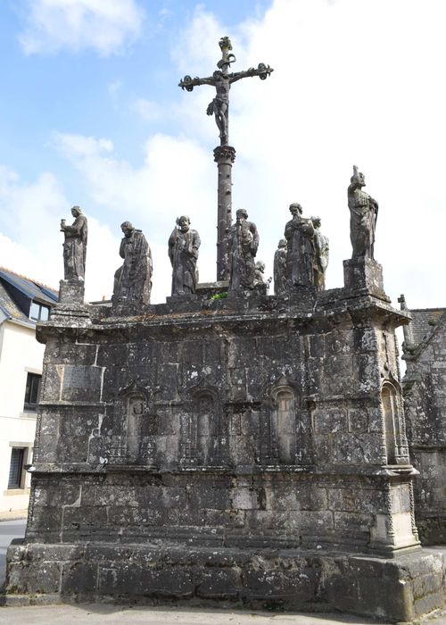 Le calvaire (ci-dessous) est un massif triangulaire orné de statues datant de 1870 qui remplacent celles qui furent brisées en 1793, lors de la Révolution française. Ces statues représentent les treize apôtres ( le treizième étant Saint Paul). Le Christ tomba le 12 décembre 1978 mais fut restauré. Ce monument est classé monument des Beaux Arts. Un pardon est organisé chaque année (le premier dimanche de juillet) à Notre Dame de Confort.