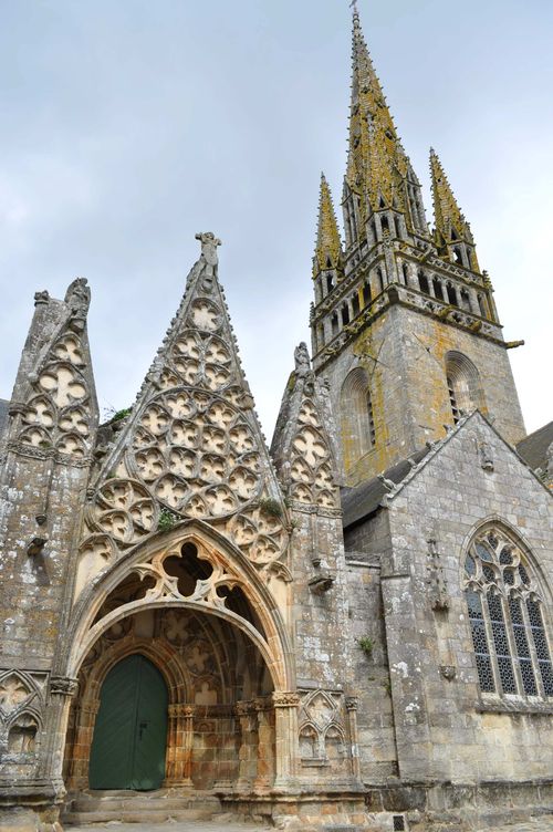 Edifiée sur la place de 1425 à 1480, elle fut offerte grâce aux donations des ducs de Bretagne. L'église est l'un des plus beaux exemples de l'art ogival flamboyant du XV ème siècle. Son vaste porche (photo ci-dessus) en témoigne. L'édifice est coiffé d'une tour à quatre piliers, qui a perdu définitivement sa flèche octogonale en 1808 (celle-ci fut foudroyée à plusieurs reprises). La nef est divisée en trois parties avec son chevet lumineux, ses voûtes de pierre et ses croisées d'ogives. Son mobilier est exceptionnel: retables,statues de Saint Corentin et de Saint Renan. Autrefois, Locronan était un haut lieu de pélerinage et l'on disait qu'une seule grande troménie (pélerinage) dans sa vie ouvrait les portes du Paradis. La Troménie (tour du territoire monastique) était composée de douze stations ( sur un total de douze kilomètres). Il fallait déjà avoir l'énergie nécessaire pour marcher sur une telle distance mais on pouvait « se payer un pauvre » qui faisait le pélerinage à votre place. A chaque station était lu un passage de l'Evangile. De nos jours, une troménie est organisée chaque année à la mi-juin à Locronan.
