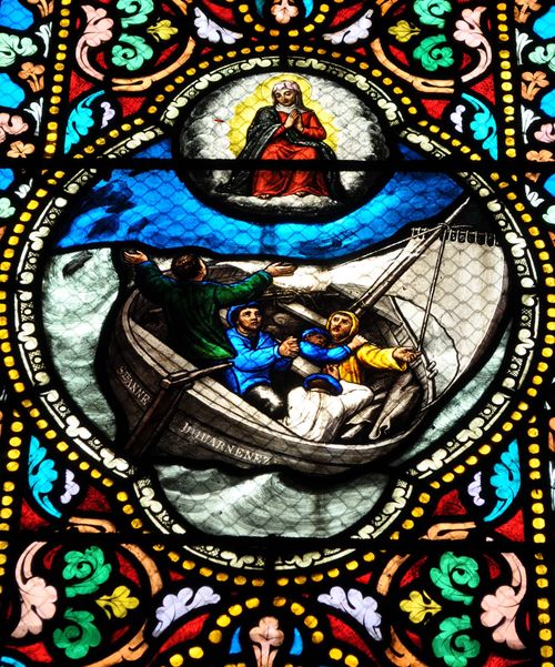 Je rends visite à l'église du Sacré Coeur, située au-dessus du port, à quinze minutes de là. Elle fut bâtie en 1874 d'après les plans de Joseph Bigot. De style néo-gothique, elle possède un mobilier datant surtout de la fin du XIX ème siècle. A l'intérieur, mon regard est attiré par le superbe vitrail de Sainte Anne , que les marins venaient implorer pour leur protection quand ils partaient en mer. Au XX ème siècle, 870 marins périrent en mer à Douarnenez.