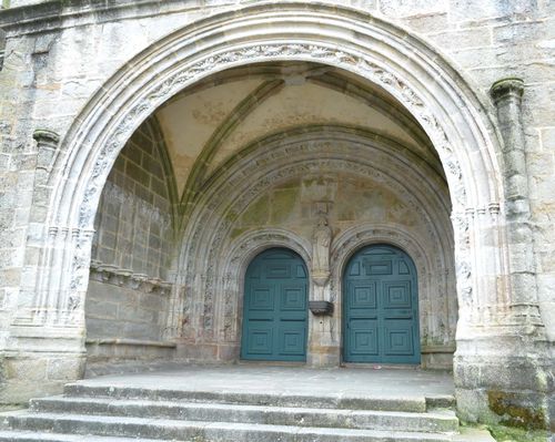 Je m'arrête bientôt à Pont Croix (pont au croisement des routes). Bâtie au fond de l'estuaire du Goyen, à l'époque féodale,Pont Croix deviendra l'une des plus puissantes seigneuries de Bretagne. Au Moyen âge, artisans et commerçants prospérèrent autour du château mais l'ensablement de son port et de la rivière mettra un coup d'arrêt à son développement. Aujourd'hui, on y admire encore l'église de Notre Dame de Roscudon, fondée au XIII ème siècle par les seigneurs de Pont Croix. Son superbe porche date du XIV ème siècle. Et la flèche gothique surplombant la tour romane inspira Joseph Bigot pour édifier les flèches de la cathédrale de Quimper.