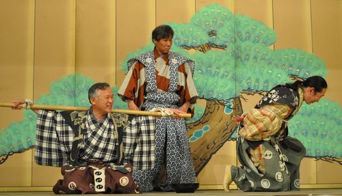 Le Kyogen, lui est un style théâtral comique ancien joué comme interludes dans les pièces de théâtre Noh et dans un langage populaire quotidien. Ce théâtre a débuté à partir du XV ème siècle. Il consiste en une danse primitive avec des cascades acrobatiques , qui est interprétée lors de la plantation du riz ou des supplications aux Dieux pour des récoltes fructueuses pendant les cérémonies aux sanctuaires. Après le XVI ème siècle, le kyogen devint populaire, surtout chez les soldats guerriers du temps des shogounats. Son symbolisme ( à l'opposé du formalisme du théâtre Noh) et ses dialogues ont très vite retenu l'attention des critiques. Il existe de nos jours deux écoles de kyogen: L'école Okura et l'école Izumi. Les masques, eux, sont utilisés uniquement dans quelques pièces. La pièce présentée à Gion Corner recèle complots et action.