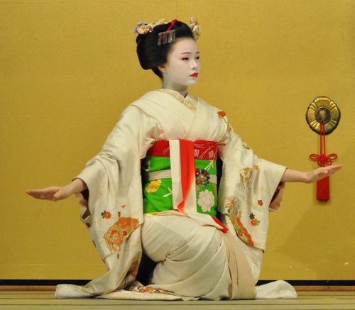 Le spectacle se termine par la danse traditionnelle de Kyoto, le Kyomai. Au Japon, il existe deux types de danse: La danse Odori qui tire ses origines de la période Edo (XVII ème siècle) et prit de l'importance à travers les pièces dramatiques du Kabuki . Ce style de danse exprime fortement le sentiment humain. L'autre danse s'appelle Mai et apparut d'abord dans l'ouest du Japon. Elle est généralement exécutée dans des pièces ( au lieu de la scène). Elle tire son rayonnement du théâtre Noh. La danse Kyomai ( danse Mai de Kyoto) naquit au XVII ème siècle et se développa durant la période Tokugawa . Cette danse adopta les bonnes manières de la Cour impériale , son élégance et son raffinement.