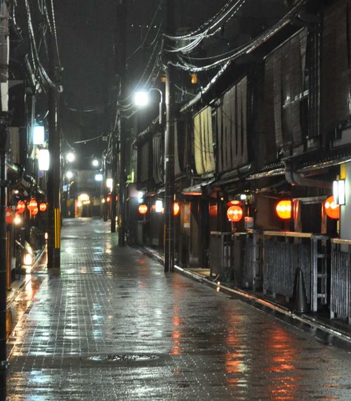 Je n'avais pas mis les pieds au Japon depuis la catastrophe du 11 mars dernier. Cette fois, je me rends à Osaka mais n'y resterai pas. Je prends le shinkansen dans l'après-midi pour aller à Kyoto. J'ai en effet prévu d'assister à un spectacle traditionnel japonais au théâtre de Gion Corner. Situé dans le hall de Yasaka , au nord du hall Kaburenjo du quartier de Gion, où les Maiko ( apprentis geishas) et les geiko (pas les lézards, les Geishas!) donnent des représentations. J'ai loué une chambre dans un petit hôtel non loin de là. Le temps n'est malheureusement pas de la partie. Il pleut par intermittence et c'est sous la pluie que je découvrirai ces rues typiques de Gion, bordées de lanternes et rappelant à quoi pouvait ressembler Kyoto autrefois.