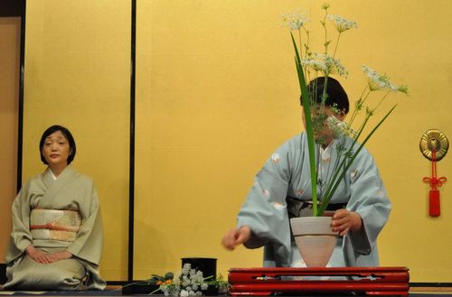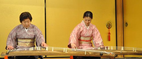 Une pause musicale s'impose avant de découvrir l'arrangement floral (Kado , nom japonais de l'ikebana, cet art floral nippon). Le koto est l'instrument de musique utilisé. C'est une harpe japonaise à 13 cordes, qui fut importée de Chine il y a 1300 ans environ. Au départ, on utilisa cet instrument pour le divertissement des gens de la Cour Impériale, lors du Gagaku ( musique de Cour). Les Japonais adoptèrent tout de suite le son agréable et sonore du koto. Depuis, la harpe japonaise a parfois fait partie d'orchestres composés d'instruments occidentaux , créant ainsi un nouveau style de musique pleine de noblesse.