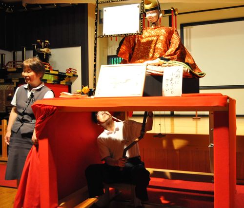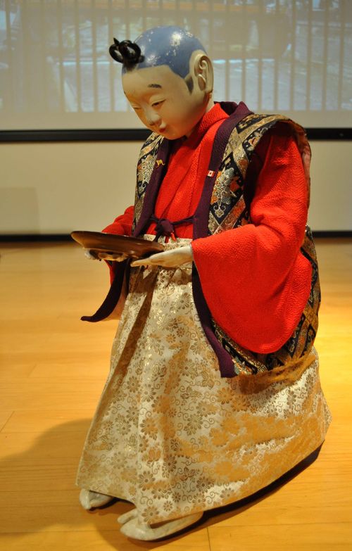 Enfin, on peut assister au Karakuri (photo ci-dessous).Ces marionnettes dédiées aux divinités se produisent devant le public pour la plus grande joie des petits et des grands. Ces marionnettes évoquent contes et légendes japonaises en exécutant diverses danses que l'on retrouve aussi dans des scénettes du théâtre Noh. Des douzaines de ficelles produisent les mouvements de ces marionnettes grâce à des marionnettistes expérimentés. Je me suis rendu au musée Karakuri ( voir infos pratiques). Ce musée vous propose de découvrir les festivités de Takayama au travers d'un petit film puis fait fonctionner devant vous différentes marionnettes. L'une d'entre elles ( ci-dessous) m'a apporté une tasse de thé vert. Le karakuri a une histoire qui débute à Edo ( l'actuelle Tokyo) en 1617 lorsque la montre dus shogun Ieyasu Tokugawa tombe en panne. Alors que l'horloger répare la montre, ce dernier est fasciné par les mécanismes divers qu'elle contient. Ce sont ces mécanismes qui ont été reproduits pour donner vie aux premières marionnettes de Karakuri. Celles-ci exécutaient leurs prestations dans des pièces de théâtre traditionnelles nippones. Dans les théâtres, le Noh, Kyogen, et le kabuki étaient très appréciés par les spectateurs. Mais le spectacle de marionnettes Takeda Karakuri Ichiza connut un succès grandissant grâce à son aspect exceptionnel. Les poupées Karakuri s'animaient ainsi sur le côté de la scène, fascinant le public. On utilisa alors progressivement ces marionnettes dans les festivals et un esprit de compétition apparut entre festivals. L'inventeur du Karakuri est Shobei Tamaya (fabricant de poupée automate). Non seulement, il créait les mécanismes mais il créait aussi les mouvements artistiques de ses poupées. Le musée Karakuri que je visite aujourd'hui est le seul musée ( au Japon et dans le monde) à posséder une telle collection d'automates datant des débuts de l'invention des marionnettes. Et dire que tout cela commença par la réparation d'une simple montre!