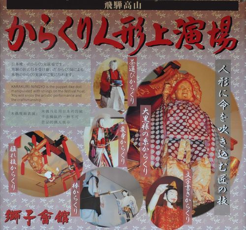 Musée du Karakuri ( à côté du hall d'exposition des chars des festivals de Takayama ) Shishi-kaikan 53-1 ,Sakura machi – Takayama . Tel: 0577 32 0881. Entrée adulte: 600 yens. Ouvert tous les jours de 10h30 à 16h45. Http://www.sisien-hida.com