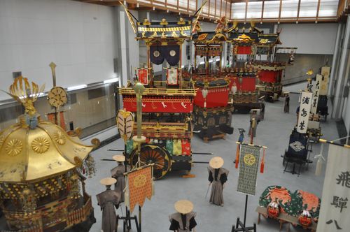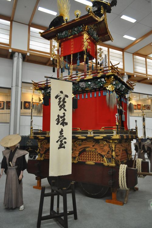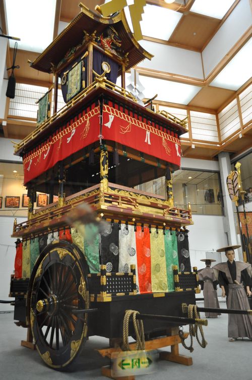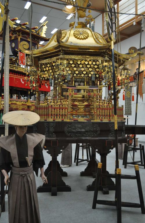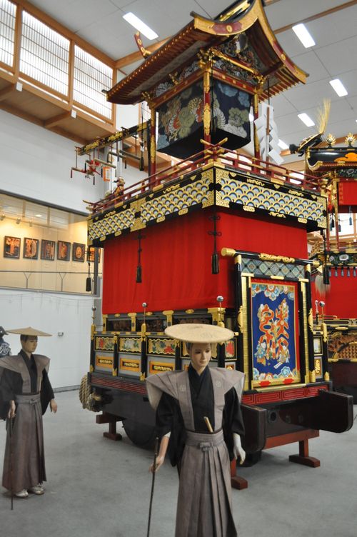 Un hall d'exposition des chars des festivals (ci-dessus) se tient juste à la sortie du Karakuri. Je m'y rends et découvre les chars , tous plus beaux les uns que les autres. Les chars (Yatai) dont la plupart datent du XVII ème siècle sont décorés de riches et complexes gravures sur bois et de minutieux ouvrages de ferronnerie. Le graphisme rappelle l'art de la région de Momoyama (Kyoto) et se trouve ici combiné à des techniques du début de l'ère Edo. Quatre chars contiennent des marionnettes à l'effigie de plusieurs divinités et personnages de la noblesse japonaise. Ces imposantes poupées vêtues de soie et de brocart sont manipulées à l'aide de fils par des professionnels postés à l'intérieur des chars. Les trois marionnettes du Hoteitai (le char du dieu de la Fortune) totalisent 36 fils et nécessitent la compétence de huit maîtres marionnettistes. Les chars ne sont pas habituellement exposés à cet endroit mais apparaissent au public par roulement trois fois par an.