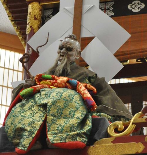 Le char Sennin-Tai (ci-dessus) contient en son sommet la marionnette d'un vieil ermite de montagne. L'histoire prétend que celui-ci, perché sue un nuage, tomba amoureux d'une lavandière. Il en tomba de son nuage. La marionnette de la jeune lavandière fut longtemps très populaire jusqu'à ce qu'un gouverneur juge qu'elle n'était pas présentable au public et la retire de la circulation.