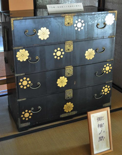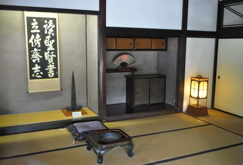 La pièce d'étude était aussi la pièce dans laquelle le lord accueillait ses invités (photo ci-dessus). Cette pièce est représentative de la résidence du daimyo de la période Edo. Deux couloirs bordent le bureau avec d'un côté ( jardin) , un sol fait de parquet, et de l'autre (côté intérieur) un sol recouvert de tatamis. Le lord ainsi que ses proches conseillers étaient les seuls à pouvoir pénétrer dans cette pièce, les autres restaient à l'extérieur, dans le couloir intérieur (sur les tatamis). Les différentes pièces sont sommairement meublées.