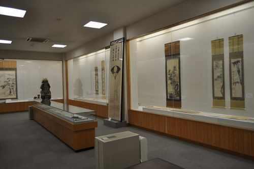 Ce musée propose aux visiteurs qui furent les ancêtres de la famille Satake, en incluant la famille Genji qui compte parmi les plus anciennes familles de lors japonais du pays. Après la guerre de Sekigahara entre Tokugawa et Toyotomi, Satake Yoshinobu reçut l'ordre de venir s'établir à Akita. Il y construisit un Château qu'il nomma Kubota, sur la colline Shinmei qu'on a rebaptisé aujourd'hui le parc Senshu. Il érigea aussi une ville autour du château. Ce dernier devint de plus en plus grand et évolua en même temps que la ville d'Akita. Il m'est donné d'admirer divers objets dans les deux grandes salles qui forment l'exposition, mais les photos sont malheureusement interdites et je n'ai reçu l'autorisation de ne prendre que des photos offrant une vue générale des salles. J'évolue ainsi au milieu des étendards, dont un étendard noir et or avec pour motif l'éventail qui se situe au milieu de la première salle. Armures de guerriers, casques et coiffures d'époque, sabres et épées, selles pour les chevaux, emblèmes de la famille Satake, garnissent les vitrines de cette première salle. Dans la deuxième salle se trouvent des parchemins, et même un porte-parchemin en bambou. Mais aussi de la vaisselle (ainsi que des restes retrouvées lors de fouilles archéologiques sur les lieux), une armure de guerre , ses protège-jambes et ses chaussures, et des livres. Je n'ai qu'un regret: L'exposition n'est présentée qu'en langue japonaise. Ce qui limite bien entendu son intérêt.