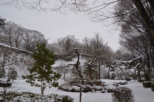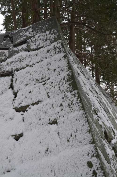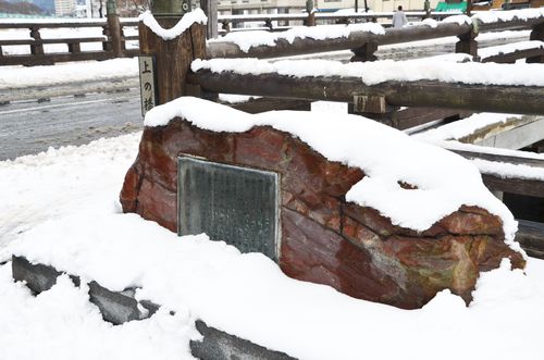Je ne pouvais pas quitter Morioka sans visiter ses incontournables. Parmi les endroits remarquables de cette ville, il y a le parc Iwate (photo ci-dessous). Ce parc accueille encore aujourd'hui les ruines de ce qui fut la château de Morioka, l'ancienne résidence de la famille Nambu. Il était aussi familièrement appelé « château de Kozukata ». Sa construction fut entreprise à partir de 1597 et s'acheva en 1633. Celui-ci fut érigé sur une colline de granit située au milieu de la ville, et aux confins des rivières Katakami ( à l'ouest) et Nakatsu (au sud-est) qui lui servaient de douves naturelles. Une enceinte secondaire était positionnée sur la partie nord de la citadelle intérieure et un pont peint en rouge enjambe le fossé qui sépare les deux enceintes. Le temps neigeux qui domine ce dimanche sur la région ne me permet malheureusement pas de distinguer tous les détails du parc mais je peux encore observer les murailles de l'ancienne enceinte. Par respect pour le shogunat, le château de Morioka ne possédait pas de donjon, mais une poivrière de trois étages, construite sur la base du donjon. La poivrière est cette guérite faite de maçonnerie et à toit conique, placée en encorbellement à l'angle d'un château afin d'en surveiller les abords. Le château possédait à l'origine trois bâtiments: Honmaru, le bâtiment ou le lord et sa famille vivait et travaillait, Ninomaru, bâtiment qui accueillait les officiels et les membres du clan Nambu, et Sannomaru, le bâtiment réservé aux rituels shintoïstes. Démoli en 1874, le château fut transformé en parc Iwate dans lequel on peut trouver un monument portant un poème de Kenji Miyazawa qui aimait beaucoup cet endroit. Poète mais aussi auteur de contes, ce dernier sera aussi connu pour sa ferveur bouddhique et son militantisme social. Très tôt, il fera preuve de compassion vis à vis du triste sort de la paysannerie nippone et écrira ses premiers poèmes à l'âge de treize ans.