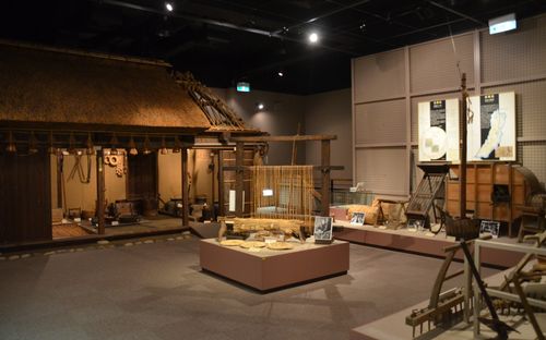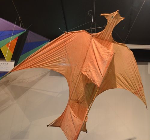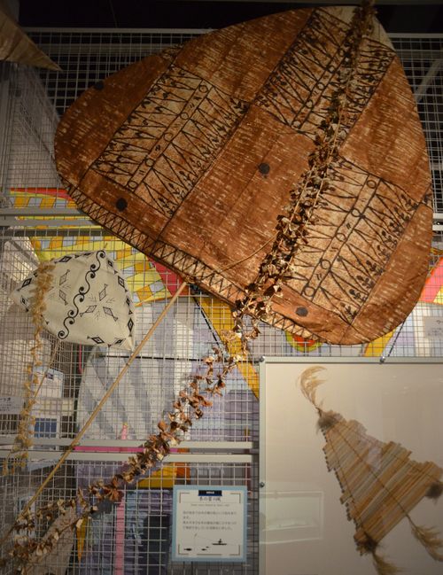 Voici maintenant la galerie des cerfs-volants d'Europe et des Etats Unis. Hiromi attire mon attention en direction d'un engin ressemblant à une chauve-souris (ci-dessous). Il s'agit d'un cerf-volant français, datant de 1900, un cadeau offert par Pierre Fabre au musée. Pierre Fabre est cerf-volantiste et appréhende le vent comme une matière sculptante qui donne forme à ses créations (dont des cerfs-volants). Visiter le musée Odako de Shirone, c'est aussi faire le tour du monde: Me voici dans les Iles Salomon, face à des cerfs-volants végétaux (ci-dessous). Juste à côté, j'admire deux cerfs-volants polynésiens (deuxième photo). Le musée permet enfin au visiteur que je suis de me plonger quelques instants dans les traditions japonaises. Nous traversons en effet, Hiromi et moi, quelques salles rassemblant des objets traditionnels nippons qui servirent à la vie quotidienne des habitants locaux (quatrième photo): Habits, outils, et même une reconstitution d'une maison japonaise avec son toit en chaume. Ces objets furent parfois découverts dans des ruines de ces plaines inondées de la rivière Shinano et témoignent de l'acharnement de l'homme à faire face aux offensives constantes de l'eau.