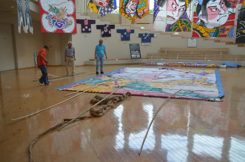 Dès le mois de mars, on commence à fendre le bambou qui servira de structure pour les futurs cerfs-volants. Savoir-faire et expérience sont alors indispensable pendant cette étape. Après avoir savamment constitué la structure de l'engin (ci-dessous), on s'emploie à habiller le cerf-volant à l'aide d'une voilure. Celle-ci est conçue à l'aide de 324 feuilles de papier washi (ce papier japonais extrêmement résistant) collées les unes aux autres (c'est le nombre de feuilles nécessaire pour un cerf-volant géant). Vient ensuite le moment de donner vie à l'objet en y dessinant des dessins uniques pour chaque pièce (chaque équipe a ses propres motifs et ce pendant des années durant), dessins qui seront ensuite peints à l'encre et avec des couleurs chatoyantes. Les dessins ressemblent parfois à des guerriers de style ukiyoe, ou bien à des personnages de kabuki, des visages de la mythologie japonaise ou encore à des papillons ou à des daurades. Enfin, le moment délicat est celui qui consiste en la pose des codes (emplacement du guide hanao). Cette étape est primordiale car d'elle, dépendra le bon vol (ou pas) de l'engin.