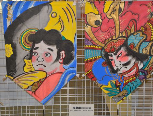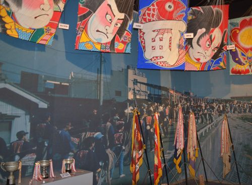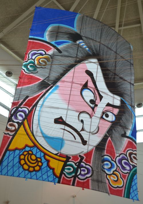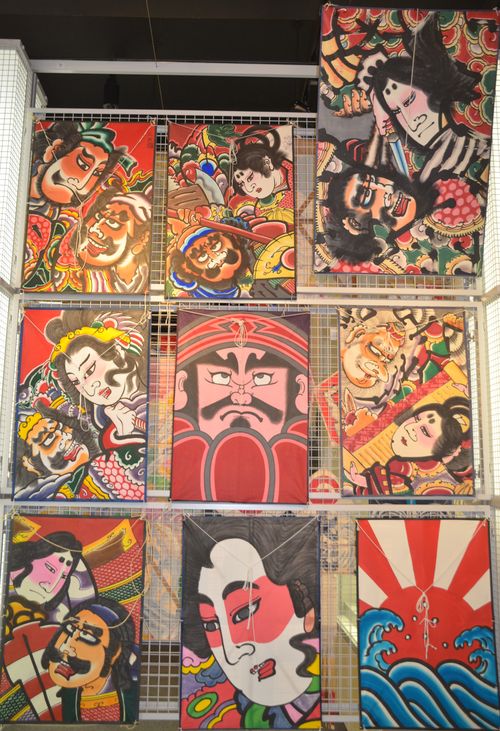 J'arrive sur les coups de neuf heures au musée et Hiromi Endo, ingénieur de la télévision NHK à la retraite, vient m'accueillir. « Vous êtes le premier français à visiter notre musée » me dit-il. « So desu ka »(vraiment?). Il ne me quittera plus durant l'heure et demie que durera la visite des lieux. Il me présente au directeur du musée, Monsieur Yukio Kondo, à qui je remets également ma carte de visite. Je commence par la projection d'un film d'une dizaine de minutes sur la bataille des cerfs-volants géants, en 3D. Film extrêmement instructif et qui vous donne la sensation d'être dans la manifestation car vous vivez les scènes en relief (grâce aux lunettes spéciales 3D). Hiromi m'accompagne ensuite et me fait faire le tour du propriétaire, à commencer par une photo gigantesque de la rivière au-dessus des rives de laquelle figurent les treize cerfs-volants correspondant aux treize équipes participantes à la bataille du festival annuel (ci-dessus). Plus loin, plusieurs salles offrent d'admirer des centaines de cerfs-volants venus de tout le Japon. Il y en aurait 600 au total (photo ci-dessous), originaires des régions du Kinki, Chugoku, et de Shikoku , de la région de Michinoku, du Kanto, de Tokai (à l'est du pays), et de l'île de Kyushu.