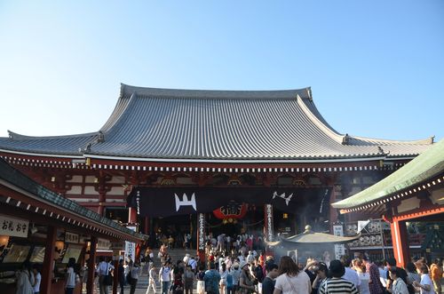 Quant à l'histoire du temple Senso-ji, la voici: Un certain matin du 18 mars 628, deux pêcheurs, Hinokuma Hamanari et son frère Takenari étaient en train de pêcher dans la rivière Sumida. Oudain, leur filet attrapa quelque chose. Ils le remontèrent et découvrirent une statue. Lorsque le chef du village d'Asakusa, Haji no Nakatomo apprit la nouvelle, il se rendit compte que cette statue représentait Bodhisattva Kannon, divinité bouddhiste. Et consacra le reste de sa vie, en tant que prêtre bouddhiste, à vénérer cette divinité, puis transforma sa maison en temple. C'est ainsi qu'Asakusa, au départ simple village de pêcheurs le long de l'estuaire de la baie de Tokyo, devint un lieu peu à peu visité par des pèlerins. Il faudra cependant attendre la venue d'Ennin, le plus grand prêtre du temple de l'école Tendai du bouddhisme, au milieu du IX ème siècle, pour qu'une statue (identique à celle qui avait été trouvée dans la rivière et qu'on avait protégé du regard des hommes) soit érigée pour que le peuple afflue aussitôt afin de la vénérer depuis. Durant la période Kamakura, les shoguns, hommes forts du pays, vouèrent une grande dévotion à Senso-ji. Puis d'autres figures importantes, militaires et hommes lettrés, suivirent leur exemple. On consacra beaucoup de soin au temple et Tokugawa Ieyasu accrut encore le rôle du temple en en faisant un lieu de prières du shogunat. Senso-ji demeure aujourd'hui le plus ancien temple de Tokyo. Il reste toujours dans l'esprit des gens le lieu de vénération de Bodhisattva Kannon ( qui soulage les souffrances) et accueille, à ce titre, quelques trente millions de visiteurs chaque année.