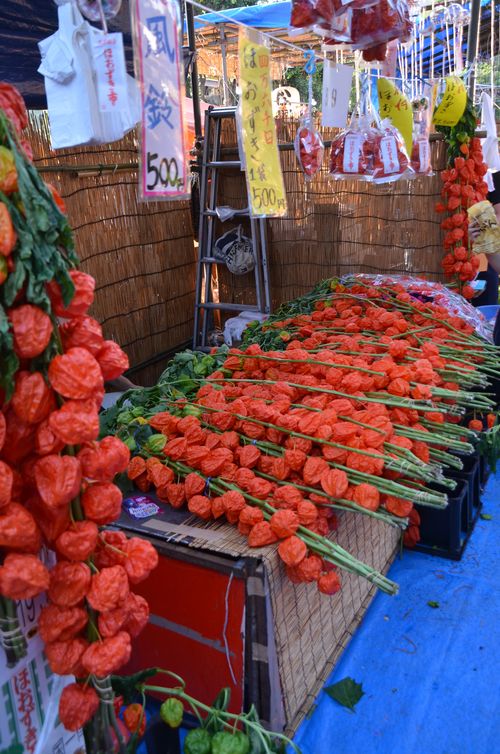 Hozuki-ichi représente durant ces deux mêmes jours ( 9 et 10 juillet) la foire aux plantes des lanternes chinoises. A cette occasion, 10450 étals vendent des plantes en forme de lanternes (appelées hozuki)(ci-dessous) tandis que 350 autres marchands animent la nuit de leurs cris en proposant d'autres marchandises aux passants, dans l'enceinte du temple Senso-ji. Une certaine cerise, la cerise de terre, est particulièrement populaire pour ces lanternes chinoises. Celle-ci est cultivée au printemps, à Shikabone-cho (Edogawa) pour célébrer ces deux journées de fête au temple d'Asakusa. Mais il arrive que la météo défavorable ne permette qu'une simple récolte et que le prix de ce fruit atteigne des sommets. Le Hozuki-ichi, est, dit-on, apparu il y a 200 ans durant l'époque Meiwa (1764-1771). D'après le récit de Kumo no Itomaki (Santokyoden), un employé d'une caserne de samourais tomba sur un plant de ces cerises alors qu'il nettoyait le jardin et se souvint alors qu'Atago Gongen lui était apparu en rêve la nuit précédente (Atago Gongen est un kami (dieu) japonais sensé protéger contre le feu, et disposant de 900 sanctuaires dans tout le pays), décrétant que si un adulte mangeait une cerise verte le 24 juin (journée d'accomplissement d'actes de mérite) dans un sanctuaire atago , celui-ci se libérerait de tous ses problèmes et ses enfants seraient guéris de la maladie. Nombreux furent ceux qui essayèrent cette recette, et , la trouvant efficace, firent passer cette cerise pour un remède miracle. De là vient l'hozuki-ichi, fête du temple Senso-ji. Depuis, les Japonais achètent leurs plants de hozuki agrémenté d'une clochette ( vidéo 1)