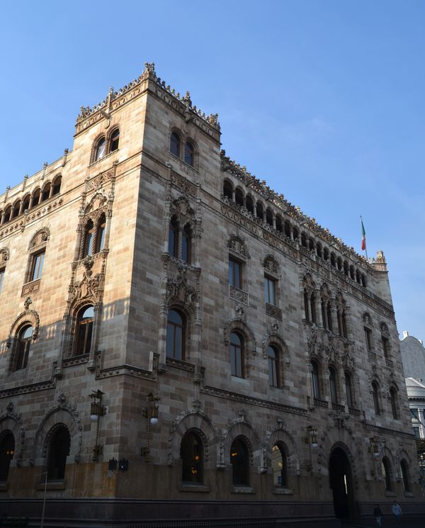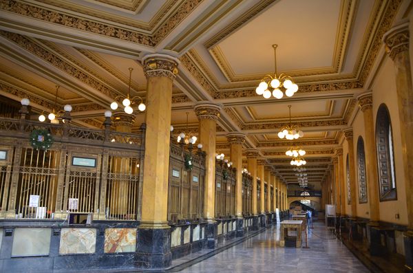 En se rendant en direction de l'Alameda Central, on trouve quelques exemples d'architecture porfirienne éclectique notamment dans la rue 5 de Mayo ou dans la rue Madero ( rue piétonne avec artistes urbains et musiciens comme ci-dessous). La Place Manuel Tosa offre une grande harmonie architecturale avec des édifices comme le Musée national des Arts, le Palacio de Mineria et son salon du livre, et le Palais postal (dont on peut admirer l'intérieur sur la deuxième photo ci-dessous) dont l'architecture raffinée est inspirée de celle de Venise (troisième photo). On relève aussi le superbe Palais des Beaux Arts, qui avait donné lieu à un précédent reportage sur ce site. Sa salle de concerts est l'une des plus belles au monde et est ornée de sculptures Art nouveau. En face de ce palais, s'élève La Torre Latinoamericana (quatrième photo) qui fut le premier gratte-ciel de la ville et, à l'époque, construction la plus haute d'Amérique latine dont le mirador offre par beau temps de belles perspectives sur l'ensemble de la ville.