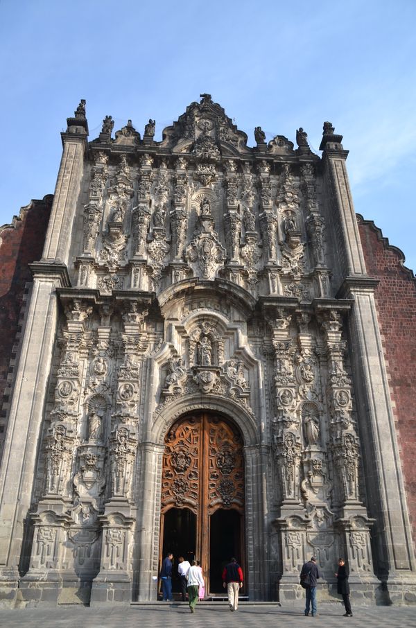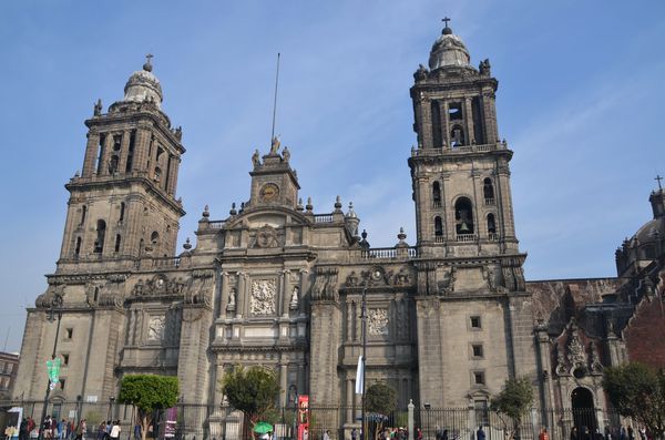 La Place de la Constitution, appelée aussi Zocalo, est située au cœur de la capitale. Elle est l'une des plus grandes places au monde. Le terme zocalo vient de l'italien zoccolo (piédestal) ou socle (zocalo). Cette place fut édifiée au XVI ème siècle par les Conquistadors, à l'endroit même où se tenait le centre politico-religieux de Tenochtitlan, alors capitale de l'empire aztèque. On y voit la Cathédrale métropolitaine de Mexico ( ci-dessous). C'est la plus grande cathédrale d'Amérique et elle fut construite dans un style baroque espagnol avec ses deux tours néoclassiques de 64 mètres de hauteur, et qui portent dix-huit cloches. Trois ans après la conquête espagnole de la cité aztèque de Tenochtitlan, Hernan Cortès entreprendra la construction d'une première église, qui sera convertie en cathédrale par Charles Quint et le Pape Clément VII d'après la bulle du 9 septembre 1530. La cathédrale obtiendra le titre de métropolitaine en 1547 sur décision de Paul III. Devenu très vite trop petit, l'édifice fut détruit en 1571. Une nouvelle cathédrale fut alors bâtie par le vice-roi Martin Enriquez de Almanza et l'archevêque Pedro Moya de Contreras. Celle-ci sera consacrée en 1667. A l'intérieur, une curiosité: La chapelle latérale, la Sagrario (deuxième photo), de style churrigueresque mexicain, fut érigée entre 1749 et 1769. Le style baroque churrigueresque se caractérise par une abondance ornementale et apparaît en Espagne au XVIII ème. Il tient son nom à la famille des Churriguera, sculpteurs à Salamanque. Il faudra attendre 1813 pour que la cathédrale soit complétée par des éléments finaux, deux clochers et un dôme central, qui sont l'œuvre de l'architecte néo-classique espagnol Manule Tolsa.