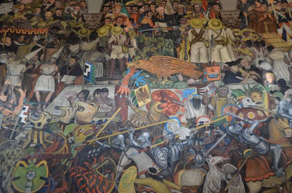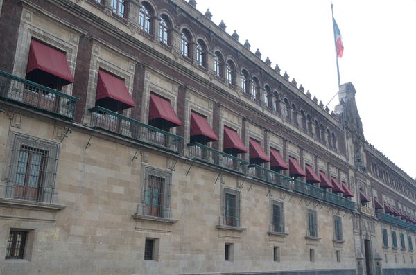 A deux pas de là, j'admire le Palais National, siège du pouvoir exécutif fédéral au Mexique (ci-dessous). Ce site fut un palais conçu pour la classe dirigeante mexicaine depuis l'empire aztèque et beaucoup de matériaux de construction proviennent du palais d'origine ayant appartenu à Moctezuma II. Long de 200 mètres, ce palais abrite les bureaux du président du Mexique, le Trésor fédéral et le bureau des archives nationales. Sa façade est bordée par deux tours, au nord et au sud, et comprend trois portes principales. Il faut emprunter la porte sud pour accéder aux bureaux du président tandis que la porte nord est connue sous le nom de Porte Mariana nommée ainsi en l'honneur de Mariano Arista qui l'avait construite en 1850. On peut observer, au-dessus de la porte centrale, le balcon principal où, juste avant 23 heures, le président mexicain prononce le Grito de Dolores (l'appel à la sédition contre les autorités soumises aux ordres de Joseph Bonaparte en Nouvelle-Espagne lancé par le curé Miguel Hidalgo le soir du 15 septembre 1810, dans la localité de Dolores, près de Guanajuato) tous les 15 septembre, lors d'une cérémonie de commémoration de l'indépendance du pays. Durant cette cérémonie, une cloche suspendue au balcon, sonne. C'est cette cloche que le Père Hidalgo fit sonner en 1810 pour appeler à la révolte contre l'Espagne. A l'intérieur du palais se trouve un patio principal, entouré d'arcades de style baroque. Dans une cage d'escalier, une peinture murale représente l'histoire du Mexique de 1521 à 1930, sur une surface de 450 m2. L'œuvre s'intitule « L'épopée du peuple mexicain » ( ci-dessous).