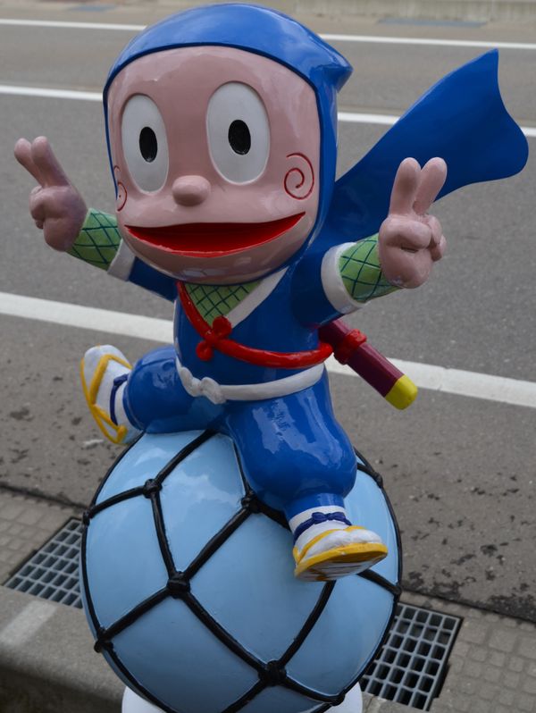 Mais revenons sur l'histoire qui nous intéresse aujourd'hui et dont on voit les personnage dans les rues de Himi: Ninja Hattori-Kun. Ce manga fut créé par Motoo Abiko puis adapté plus tard pour une série télévisée , une série animée, un jeu vidéo, et une série « anime » sur les ondes en 2012. Le personnage central est un petit garçon de 10 ans, Kenichi Mitsuba, qui connait des difficultés scolaires dès l'école primaire. Il est aussi têtu et très paresseux, bref, il a tout pour réussir dans la vie! Mais un petit Ninja, Hattori Kanzo se lie d'amitié avec Kenichi. Et devient très vite un membre de la famille Mitsuba, entre Shinzo, le frère de Kenichi et  Shishi-Maru, son chien Ninja. Hattori aide Kenishi à résoudre ses problèmes tout en veillant constamment sur lui. Kenishi a aussi une petite amie (Déjà? À dix ans?) qui s'appelle Yumeko-Chan. On trouve aussi dans le scénario Kemumaki, le chien ninja et Kageyiko, le chat ninja. Tous les deux passent leur temps à chicaner le petit Kenishi...Tout un programme!
