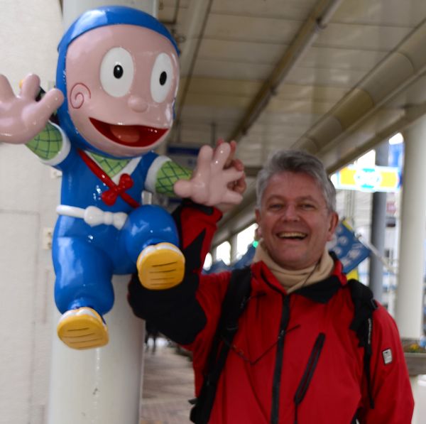 Comment en savoir plus à propos de ces étranges personnages qui jalonnent la ville? Je me suis bien arrêté à la Galerie des Mangas mais personne ne parle l'anglais et il m'est difficile d'obtenir des informations. On me fait juste comprendre que l'artiste est Fujiko Fujio A. En fait ce nom n'est que le nom de plume d'un duo écrit par deux artistes de manga japonais: Hiroshi Fujimoto et Motoo Abiko. Ces deux-là s'associèrent en 1951 et utiliseront le nom de Fujiko Fujio de 1954 à 1987 ( date de la dissolution de la société). Tous deux travaillaient simultanément sur les histoires et les illustrations mais leur divergence créative ont abouti à des initiatives individuelles qui furent signés de noms différents: Fujiko Fujio A (pour Motoo Abiko) et Fujiko F.Fujio ( pour Hiroshi Fujimoto). Doraemon reste leur principale œuvre: Cette histoire qui met en scène Doraemon, le personnage principal, est devenue une icône au Japon et a obtenu de nombreuses récompenses.