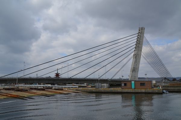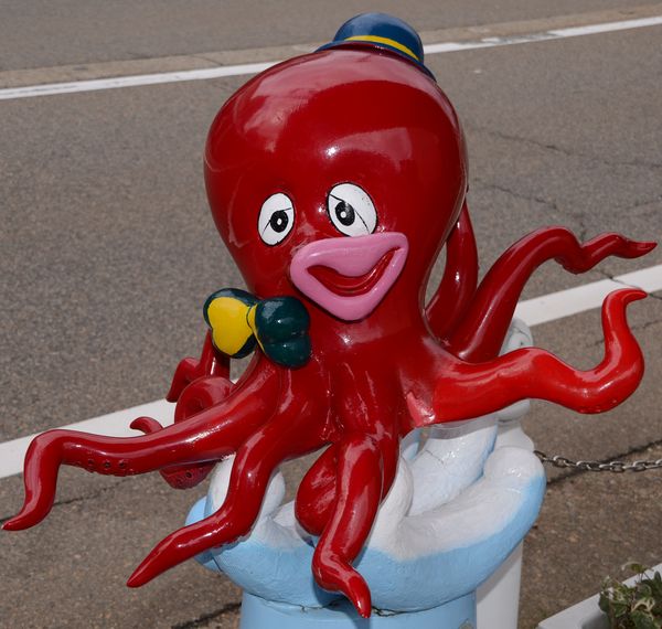 Himi est certes célèbre pour son port et le poisson frais qu'on y trouve mais en ce jour de relâche, il y a peu d'activité au port de pêche. Celui-ci ne se trouve qu'à une vingtaine de minutes de marche de la gare JR. Au port se trouve le Flesh Fish Hall (la Halle aux poissons) où le produit de la pêche est directement revendu aux poissonniers. Un restaurant vous propose de déguster sur place le Kabusu-jiru ou bien une soupe faite de poisson haché. Le port a aussi son festival, le Kitokito Flesh Festival of Food City Himi: Celui-ci se tient à la mi-octobre et offre de découvrir de nombreuses spécialités locales à base de poisson. Je longe tranquillement la côte jusqu'à parvenir aux bateaux de pêche sagement amarrés au quai (photo). On m'a bien remis un plan de la ville tout à l'heure mais il est rédigé en japonais avec de nombreux kanjis qui me sont encore inconnus. Non loin du port, j'aperçois un petit pont suspendu, le pont Himino-e (deuxième photo). Celui-ci est illuminé en blanc au printemps et en automne, en bleu l'été et en jaune l'hiver.  Pour ma promenade, je me fie aux panneaux indicateurs rédigé en alphabet romain. L'un d'entre eux m'indique « rue des Mangas ». Voilà qui sort de l'ordinaire! Je m'y engouffre donc et tombe sur une trentaine de statuettes représentant des personnages de manga. La fameuse rue s'étend du pont de Nakano-Shima jusqu'au port de pêche, en passant par l'artère principale Shoten-Gai puis Shiokaze-dori. Je photographie à tour de bras ces petits personnages fort sympathiques, en forme (ou pas) de poisson. Une trentaine de clichés vous attendent sur le site de la médiathèque (album Asie).