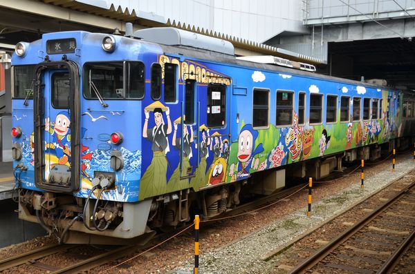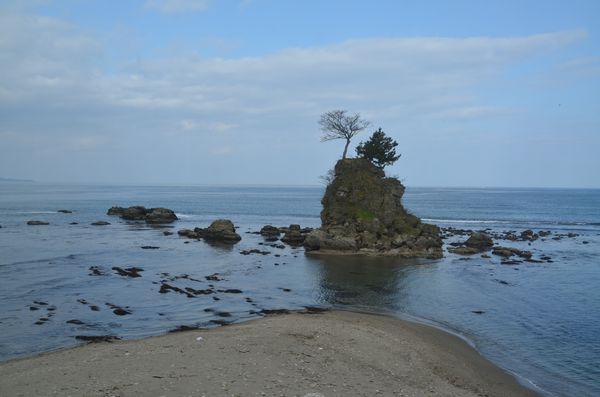 Sortir des sentiers battus est pour moi presque devenu une habitude en visitant le Japon. Embarquement ce matin, en gare de Toyama, pour Himi. Changement d'omnibus (futsu) à Takaoka. Je découvre enfin ce bord de mer (ci-dessous) de la mer du Japon. Le temps est meilleur qu'hier même s'il reste nuageux. Il y a beaucoup de monde dans l'omnibus. Nous sommes dimanche et les gens sortent se promener en famille, entre amis ou en groupe organisé. Je rencontrerai ainsi lors de mon trajet un guide touristique venu de Tokyo avec un groupe de touristes japonais. Muni de son drapeau, il alerte ses ouailles du prochain point de ralliement. Himi est la gare terminus de la ligne JR Himi Line, surtout célèbre pour son train de mangas, appelé Ninjya Hattori-kun (deuxième photo ci-dessous). Tout le monde se jette sur son appareil-photos pour fixer un souvenir mémorable et rapporter à la maison le précieux cliché. Petite ville de quelques 53000 habitants, Himi est située sur la côte de la mer du Japon. A l'abolition des clans et l'instauration des préfectures au Japon en 1871, Himi appartenait à l'origine au Clan Kanazawa (anciennement clan Kaga). Ce clan tomba sous la coupe de la préfecture de Kanazawa, préfecture qui sera ensuite divisée en trois nouvelles préfectures: Nanao, Niigata et Ishikawa (à laquelle Himi fut rattachée). En 1883, changement de programme: Himi bascula dans la préfecture de Toyama. Six ans plus tard, Himi et vingt autres villages formèrent le district de Himi. Les limites de la ville changeront à nouveau à trois reprises entre 1894 et 1954, ce qui en fait une ville peu ordinaire. Je pars ainsi à l'aventure ne sachant pas trop ce que je vais trouver comme attractions sur place, d'autant plus que nous sommes en hiver. Un rapide détour par le bureau du tourisme à mon arrivée me permettra de me procurer une brochure contenant toutes les curiosités locales, à Himi, mais aussi dans la région.