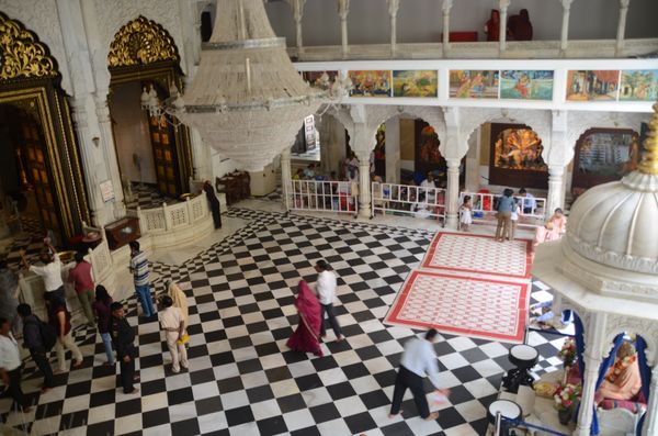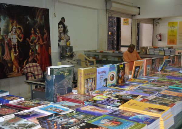 De nos jours, ce temple est l'un des plus visités du pays mais aujourd'hui, lundi, l'endroit est plutôt calme. Mon guide me conduit dans les étages d'où je pourrai observer la cour où se déroule prières et cérémonies (ci-dessous). Il est toutefois nécessaire de revenir sur l'histoire de l'association pour la conscience de Krishna : Celle-ci représente un courant de l'hindouisme qui s'inscrit dans le mouvement de la bhakti ( l'amour de Dieu, l'adoration ou la piété, une des principales composantes de l'hindouisme) dédié au seigneur Krishna (considéré par ses adeptes comme la Personne suprême). Aujourd'hui, ISKCON (abréviation de cette association) est une confédération planétaire de plus de 400 centres, incluant 60 communautés agricoles qui aspirent à l'autosuffisance dans une certaine mesure, 50 écoles et 90 restaurants. Je visite pour ma part le grand restaurant du Temple d'Iskcon à Juhu, où les visiteurs extérieurs sont conviés à goûter les mets proposés. Le mouvement ISKCON fut à l'origine fondé à New York, en 1966, par A.C Bhaktivedanta Swami Prabhupada, maître spirituel hindou originaire du Bengale occidental. Et se développa partout en Occident depuis les Etats-Unis. L'association a son siège en Inde, à Vrindavan, dans l'Etat d'Uttar Pradesh. Vrindavan est le lieu où Krishna, passa sa jeunesse il y a 5000 ans, avec sa compagne éternelle Radha et ses amis les pâtres. Plus de 150 temples consacrés à Krishna sont sous la tutelle d'ISKCON dans le monde, mais on a par contre du mal à établir le nombre exact des adeptes. La doctrine du mouvement se fonde sur les textes sacrés védiques ( principalement la Bhagavad-Gita, partie centrale du poème épique Mahabharata). Krishna y est le Dieu suprême et unique. Les textes préconisent que chaque instant de la vie des adeptes doit être utilisé pour vivre dans la conscience de Krishna (celle-ci ayant le pouvoir de libérer l'individu mais aussi de sauvegarder le monde). Pour cela, les adeptes doivent suivre un régime végétariste strict, en s'abstenant de manger viande, poisson et œufs. Les autres aliments ne peuvent être consommés qu'après avoir été consacrés, offerts à Krishna pour en demander la «prasada » (la grâce ou miséricorde de Dieu). Les substances dites « excitantes » comme le tabac, l'alcool, la drogue, le thé ou le café, sont proscrites. Les jeux de hasard aussi. Et la pratique de la sexualité n'est pratiquée que dans le cadre du mariage.