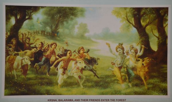 Lors de ma visite au temple, je traverse plusieurs couloirs qui exposent de nombreuses peintures représentant Krishna dans des scènes de vie : Les épisodes de Krishna-enfant sont nombreux et la scène de Krishna entrant dans la forêt de Vrindavan ( en photo ci-dessus) reste un thème central des discours dévotionnels en Inde et sont censés contenir de grands mystères ésotériques. Krishna-berger est aussi représenté comme le dieu des pâtres. On le montre aussi souvent en train de jouer de la flûte, et séduisant les gopis de Vrindavan. Cette visite de temple me transporte dans un monde religieux qui m'est complètement inconnu mais que je ne demande qu'à découvrir. La visite du temple de Juhu aura été une bonne entrée en matière...qu'en pensez-vous?