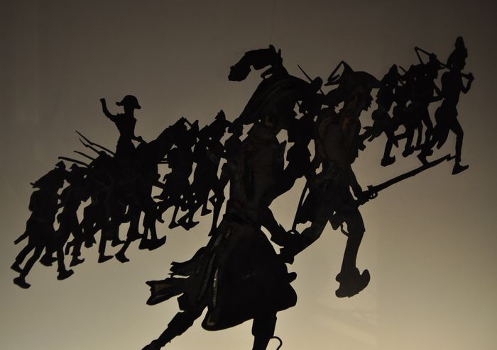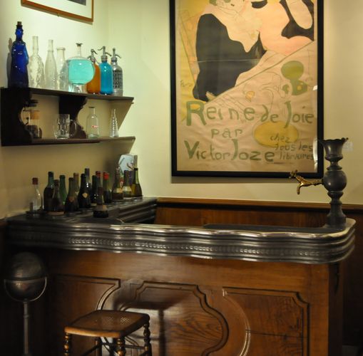 La quatrième salle d'exposition nous fait découvrir le « nouveau » Chat Noir, situé au 12, rue Victor-Massé: Le cabaret fera beaucoup pour le monde artistique parisien, sa plus importante contribution restant sans doute le théâtre d'ombres, créé en 1886 par Henri Rivière et Henri Somm. On y trouve notamment ces gendarmes qui furent les premiers personnages découpés dans le zinc (ci-dessous). Ce théâtre illustrera le credo du Chat Noir : Etre moderne avant tout. Offrant d'abord ses spectacles à partir d'un petit théâtre de marionnettes, l'endroit se transforme sensiblement en 1887 en accueillant une production artistique plus élaborée et traitant de sujets divers comme cette pièce « Ailleurs » présentée pour la première fois le 11 novembre 1891. Douze mécaniciens ainsi que les amis, qu'ils soient scénaristes ou assistants techniques, mais aussi chanteurs, artistes et musiciens, apportent alors leur précieux concours à ce théâtre d'ombres qui offre un contenu réaliste et symboliste agrémenté d'effets visuels : Le décor se compose d'un fond blanc et de grands aplats de couleur, tandis que la composition et l'accentuation des deux dimensions et des silhouettes présentées forment des composantes essentielles. De 1886 à 1896, des milliers de personnes se succéderont ainsi dans le cabaret pour venir voir les fameuses pièces du théâtre d'ombres. La septième salle de l'exposition aborde Aristide Bruant et son « Mirliton » (l'ancien premier Chat Noir, deuxième photo ci-dessous) et les cafés du quartier qui s'installent autour du Chat Noir. Bruant, lui aussi, créera sa propre revue, Le Mirliton, pour y publier ses chansons illustrées par des dessins de Toulouse-Lautrec et de Steinlen. L'occasion m'est offerte d'admirer dessins et affiches du cabaret Bruant et d'y découvrir le thème populaire des cafés parisiens et montmartrois, sujet important de cette fin de siècle. Dès le début du XVII ème siècle, le café parisien devient en effet un lieu public de consommation de boissons, puis un lieu de rendez-vous pour poètes et artistes qui s'y produisent parfois. La transformation de la capitale par le Baron Haussmann va transformer le café qui va peu à peu s'équiper d'une scène donnant sur une salle pouvant accueillir jusqu'à 1500 personnes. Entre 1880 et 1890, Paris comptera plus de 350 cafés-concerts. La visite permet également d'aborder l'influence du théâtre d'ombres sur l'art du symbolisme, sur les Nabis et les théâtres libres: Le mouvement nabi ( dont les membres sont les Nabis) fut un mouvement artistique postimpressionniste d'avant-garde, né à la fin du XIX ème, et qui perdurera jusqu'au début du XX ème. Les Nabis (mot signifiant prophète en hébreu) ont alors de grandes ambitions intellectuelles et spirituelles, et s'attachent à retrouver le caractère sacré de la peinture tout en provoquant un nouvel élan spirituel au moyen de l'art. L'exposition présente des œuvres de Nabis comme celles de Vuillard et Bonnard, qui furent conçues pour deux importants théâtres montmartrois, le Théâtre libre et le Théâtre de l'œuvre. L'accent est mis sur le lien thématique et stylistique entre le théâtre d'ombres du Chat Noir et la peinture symbolique au travers d'œuvres de nombreux artistes. Non loin de là, j'aperçois le bureau de Gustave Charpentier où est évoquée sa célèbre pièce de Louise à Montmartre.