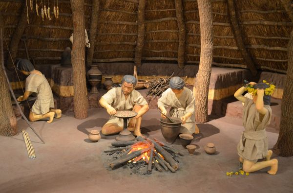 Je suis très surpris par la vivacité d'esprit des deux enfants d'Abe. Point de jeux vidéo en main mais un livre contenant des cartes illustrées des pays du monde entier. Les questions fusent et la curiosité prend vite le dessus. J'essaie de répondre le mieux possible avec mes quelques rudiments de japonais. On m'interroge sur mon pays, sur les voyages que j'effectue à l'étranger et sur la durée de mes escales. Un vrai bonheur que ce jeune public passionné qui s'intéresse à tout! Il est temps de nous rendre maintenant au musée départemental de la nature et de l'histoire du Miyazaki. Autrefois, existait un autre musée qui ouvrit ses portes en 1951. Le musée actuel fut érigé en 1971 auquel on rajouta ensuite une section d'histoire naturelle et une section Beaux-Arts. Le lieu propose de découvrir le milieu naturel de la préfecture du Miyazaki à travers un parcours pédagogique reconstitué de manière attractive: La forêt sempervirente abrite chamois et cerfs de Kyushu tandis que les bords d'eau sont classés en fonction de la nature de l'eau (marécage de Kawaminami, rivage Caouanne et récifs coralliens). Le musée s'intéresse aussi à la formation du Miyazaki et aux espèces naturelles (découverte de fossiles sur le Mont Gion, les singes de l'île Kojima, les espèces végétales spécifiques à la région, les espèces en voie de disparition). La section historique, elle, aborde les origines du Miyazaki de la protohistoire à nos jours, en exposant des documents archéologiques et des reconstitutions grandeur nature: La chasse dans la grotte d'Izuruha, la vie des hommes il y a plus de 20000 ans, l'apparition de la poterie sous la période Jomon, et l'apparition de la riziculture avec une habitation en forme de fleur (première photo ci-dessous). Des habitations sont aussi reconstituées comme cet intérieur d'une maison japonaise datant de 1945 (deuxième photo ci-dessous) ou bien cette ferme de Shiiba (troisième photo) qui fut construite en 1864. On peut aussi observer une cabane d'agriculteur du village de Nishimera, une scène de pêche à l'ayu pratiquée dans le village de Kitagawa ou bien une scène d'abattage d'arbres comme on en voyait dans le village d'Aya. Des vitrines permettent d'aborder l'artisanat des différentes époques: Une charbonnière (fabrication du charbon de bois) est reconstituée tandis que le visiteur découvre les outils de production utilisés dans les hameaux montagnards de Hyuga. Pêle-mêle, je remarque ces ustensiles ayant jadis servi lors des fêtes agricoles et pastorales, ou bien ces objets décoratifs du jour de l'An et des nuits de pleine lune et ces drapeaux hissés les jours de pêche fructueuse. La vie d'une région, c'est aussi la fête durant laquelle on invoque la protection des divinités. Prières pour la tranquillité comme pour les bonnes récoltes sont alors l'occasion de rites tout au long de l'année.