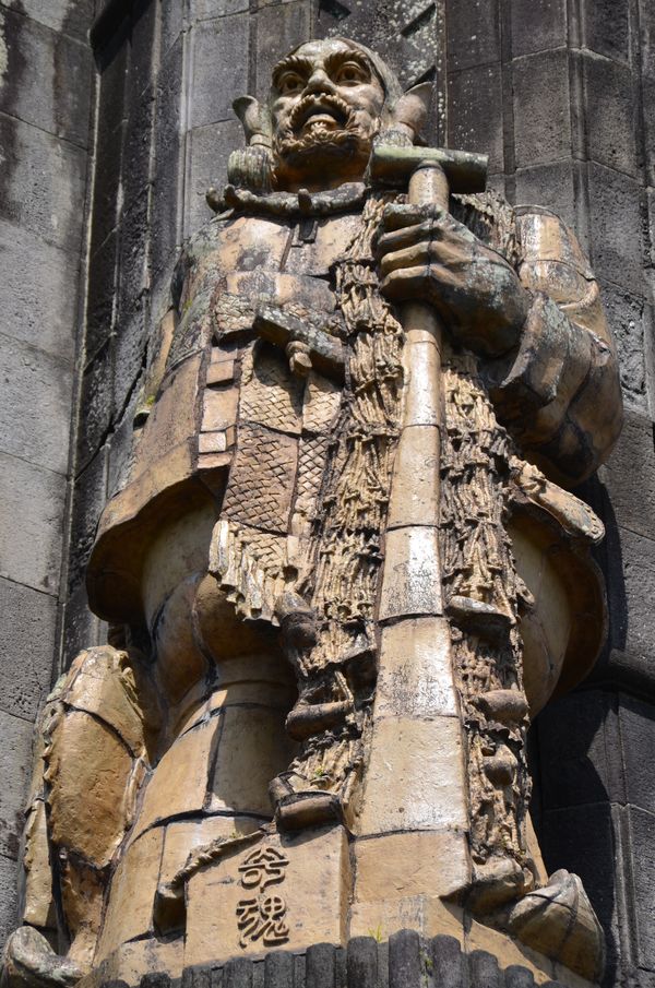 Après la pause déjeuner, nous repartons à la découverte de la ville avec la visite du parc Heiwadai (ci-dessous) et de la Tour de la Paix: Le parc Heiwadai est très fleuri en cette saison. Il fut construit en 1939 pour célébrer les 2600 ans de l'ère impériale. La Tour de la Paix fut elle aussi érigée sur une surface de 1023 m². Haute de 37 mètres, elle fut achevée en novembre 1940. C'est le sculpteur Jitsuzo Hinago qui en fut le concepteur. Pour ce faire, il disposa d'un budget de 670 000 yens de l'époque et 834 m3 de pierres (dont 1789 pierres taillées venues du monde entier) furent nécessaires à sa construction. 66500 ouvriers participèrent au chantier. J'ai déjà abordé le contexte historique de la construction de cette tour lors d'un précédent reportage mais il est toutefois utile de revenir sur la signification des symboles figurant sur la tour: Quatre statues, placées aux quatre coins de l'ouvrage, symbolisent l'image de quatre âmes (Armitama, Nigimitama, Sachimitama et, en photo ci-dessous, Kushimitama). Et une inscription sur la tour signifie la paix éternelle. La porte sur la façade avant représente la grotte de Saitobaru (celle-là même qui captura le démon). Ce site, construit entre le III ème et le VII ème siècle permit de mettre à jour des vestiges lors de fouilles effectuées entre 1912 et 1917. Saitobaru fut classé comme site historique national en 1952. Les marches de la tour de la Paix symbolisent de leur côté le trône en pierre de l'empereur tel qu'on le connait à Hyuga City. Le parc Heiwadai, d'une surface totale de 68,8 hectares, devint ainsi le pendant du parc tokyoite Hibiya en août 1965 (qui lui envoya des colombes pour l'occasion).