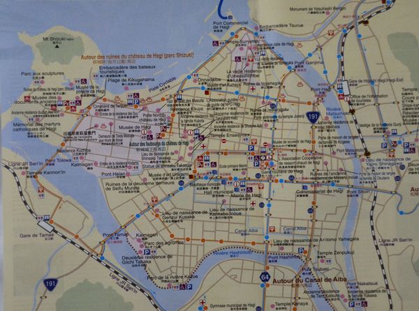 Un autre musée, le musée d'Hagi (ci-dessous) ne m'autorise pas à prendre de photos. Il retrace l'histoire de la cité à travers un certain nombre de vitrines renfermant des objets d'époque. Nous sommes désormais dans la vieille ville et je croise ici et là des maisons anciennes. C'est qu'Hagi a toujours été le berceau d'hommes célèbres: Giichi Tanaka (qui possède sa statue dans le parc jouxtant le musée précité) était un enfant de cette ville. Il fut entre autre Général de l'armée japonaise avant de devenir Premier ministre du pays et ministre des Affaires étrangères en même temps, entre 1927 et 1929. Issu d'une famille de samouraï, il sortira diplômé de l'académie militaire, servira pendant la guerre sino-japonaise, puis deviendra attaché militaire. Des douves sont encore visibles dans ce quartier ancien qui abrite notamment la Tour de guet de la famille Masuda (deuxième photo ci-dessous) qui était alors chef vassal à l'époque féodale. Le patrimoine historique est extrêmement bien tenu et des panneaux d'information, agrémentés de plans de quartier, orientent les visiteurs en langue japonaise (plus rarement en anglais). La famille Kubota possédait elle aussi une résidence (troisième photo ci-dessous). Construite durant la période Edo, cette demeure possède un plancher en forme de mezzanine utilisé autrefois pour stocker les marchandises et pour les employés. Marchand de kimonos et de saké, Shoshichi Kubota quittera Ohmi pour venir s'installer à Hagi. On peut bien entendu visiter cette demeure ( tout comme beaucoup d'autres!).