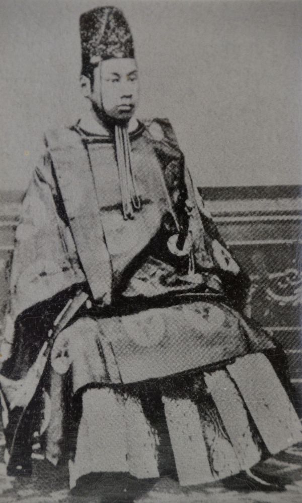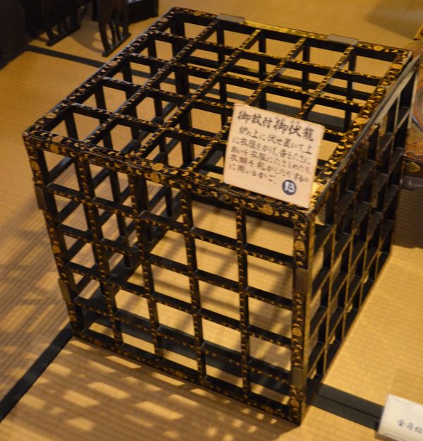 Des vitrines agrémentent la visite des lieux avec de nombreux objets anciens. J'aperçois au passage une photo du Prince Taruhito Arisugawa (ci-dessous), officier de carrière de l'armée japonaise devenu le 9è chef de la famille risugawa-no-miya. Né à Kyoto en 1835, il fut adopté par l'empereur Ninko, puis épousera la princesse Kazu-no-miya Chikako (huitième fille de l'empereur Ninko). Il sera le général placé à la tête de la croisade visant à attaquer le shogunat de Tokugawa pour permettre la restauration Meiji. Il visitera Hagi en 1890 et passera trois jours dans la résidence Kikuya. Et utilisera les différents objets présents dans la vitrine située sous sa photo. Je reviens sur mes pas puis entre dans un autre salon de la maison (appelé aussi Omoya Zashiki). J'y découvre différents objets dont cette étrange cage en bois laqué (Fusego) en photo ci-dessous pour déposer les vêtements afin de les faire sécher ou de les parfumer à l'aide d'encens.