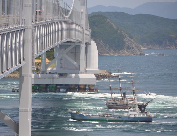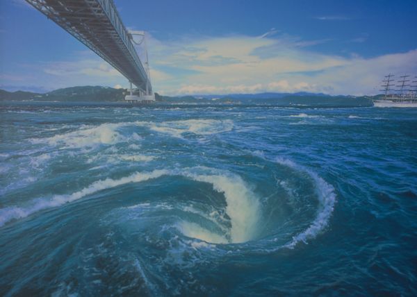 Pour mon premier périple sur l'île de Shikoku, je suis accompagné d'une amie, Soraya. C'est son premier voyage au Japon et je l'emmène observer les tourbillons de Naruto (ci-dessous), surtout visibles au printemps et en automne. Ces tourbillons sont le fruit d'un phénomène causé par l'interaction des marées dans le détroit de Naruto situé entre la Préfecture de Tokushima et l'île d'Awaji (Préfecture de Hyogo). Ces tourbillons, qui dépendent de la vitesse du courant et de la topographie du terrain, comptent parmi les plus puissants au monde: Ils se forment soudainement pour disparaître aussi vite. Parfois, deux tourbillons simultanés peuvent atteindre 20 mètres de diamètre. Le même phénomène est observable également en Bretagne (France) près de l'usine marémotrice de la Rance mais les tourbillons ne dépassent pas...2 mètres de diamètre! Le détroit que je découvre aujourd'hui est traversé par le pont de Naruto. Le courant de marée présent à cet endroit est un fort courant marin engendré par les marées. La zone resserrée par laquelle passe celle-ci est donc propice à ce phénomène et l'horaire de survenance des tourbillons change chaque jour en fonction des marées : Ces marées qui interagissent sont celles de l'impressionnant océan Pacifique et de la mer intérieure de Seto. Cette mer « intérieure » est l'étendue d'eau séparant les îles de Honshu, Shikoku et Kyushu, trois des quatre îles principales du Japon. Il serait d’ailleurs plus exact de la surnommer « mer épicontinentale »(mer créée par des transgressions marines, peu profondes où l'action du vent crée des courants) appelée aussi « mer bordière » ou « mer marginale ».