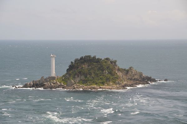 Le lieu d'observation habituel des célèbres tourbillons est le pont Onaruto (en photo ci-dessus) qui domine la mer à 41 mètres d'altitude. On peut apercevoir les tourbillons deux fois par jour. Ceux-ci ont une profondeur de 1,70 mètre et un diamètre d'environ vingt mètres. L'eau y circule à plus de 20 km/heure. Cette attraction est majeure en Asie et le nombre de touristes venus observer le phénomène ne cesse de croitre. Le pont suspendu Onaruto, lui, relie Naruto à l'île d'Awaji. Sa portée principale est de 876 mètres et il possède des travées de rive de 330 mètres chacune. Son tablier est composé d'une poutre en treillis de 34 mètres par 12,5 mètres offrant quatre voies de circulation et autorisant un gabarit maritime de 41 mètres. Ses pylônes sont en acier et culminent à 144 mètres de hauteur tout en reposant sur des tubes d'acier minimisant l'impact des courants et des tourbillons. Le pont fut inauguré en 1985 afin d'accueillir une voie ferroviaire située au niveau inférieur de la poutre en treillis. Mais cette ligne ne verra jamais le jour et ce parcours est désormais utilisé pour transporter de l'eau. 6,8 millions d'automobiles et de camions avaient déjà franchi le pont Onaruto en 2004. Pour mémoire, c'est Toranosuke Nakagawa qui, le premier, proposa en 1914 de construire un pont à cet endroit. Il siégeait alors comme représentant de la Préfecture de Tokushima à la Diète impériale et son projet fut repoussé car on prétendait qu'il était impossible d'ériger un tel pont. Le fameux pont, qui fut bâti depuis, est conçu pour durer une centaine d'années et résister à des séismes d'une amplitude maximale de magnitude huit sur l'échelle de Richter. Cela nécessite par contre un entretien permanent de la structure imposante de l'ouvrage. Avant de nous rendre sur le pont afin de rejoindre l'observatoire, Soraya et moi visitons le centre Uzu-no-michi qui offre quatre niveaux: Au rez-de-chaussée, sont présentées des informations touristiques sur la Préfecture de Tokushima. L'étage supérieur nous offre de voir un film en haute définition sur les fameux tourbillons, avant d'embarquer à bord d'un sous-marin virtuel pour un voyage(virtuel) à travers le parc national de Naruto. Au-dessus, les enfants peuvent s'initier à la pêche virtuelle tout en développant leurs connaissances sur la faune et la flore présentes à cet endroit. Soraya en profite pour effectuer une balade (virtuelle) à vélo sur le pont Onaruto. Le toit du centre offre enfin une vue panoramique sur les environs. Il ne nous faudra que quelques minutes pour atteindre le pont à travers un chemin balisé. L'observatoire ne se trouve qu'à 450 mètres de l'entrée et un vent fort nous enveloppe dès que nous franchissons le pont (à 45 mètres au-dessus du niveau de la mer). Nous apercevons au loin le phare de Tobishima (deuxième photo ci-dessous) qui voit défiler un trafic maritime intense (troisième photo).